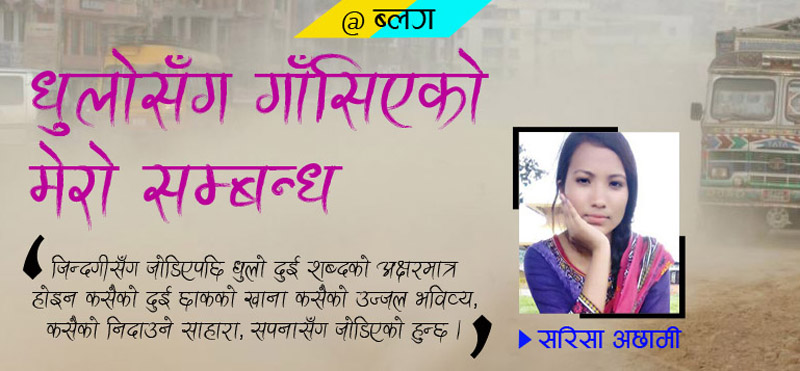 मेरो जिन्दगी काठमाडौंको धुलोसँग गासिएको छ । हामीलाई देख्नेवितिकै मुख छोप्दै डिड्ने सफा मानिसहरुले यो धुलोसँग जिन्दगी गाँसिएको भएर होला फोहोरी, भरिया, भिकारीको उपनाम दिईरहेका छन् ।