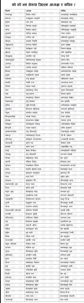 खबरज्याेति २०७६ बैशाख ९ साेमबार काठमाडौ:नेकपाले सबै जिल्लाकाे अध्यक्ष र सचिवकाे टुङ्गो लगाएको छ । सिन्धुपाल्चोकमा एमालेतर्फबाट अध्यक्ष झम्क नेपाल र सचिवमा माअाेवादी केन्द्रकाे दावा तामाङ भएका छन् । सबै जिल्लाकाे अध्यक्ष र सचिवकाे नामावली सहित
