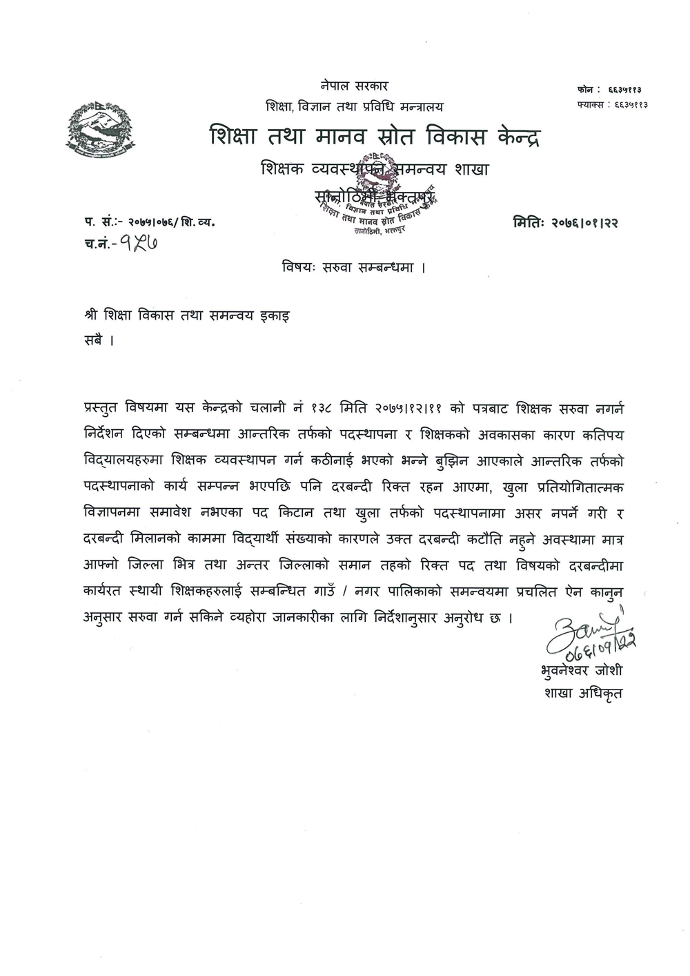 शिक्षक सेवा आयोगको आन्तरिक प्रतिस्पर्धाबाट सफल शिक्षकको पदस्थापन हुन थालेपछि विभागले गत चैत ११ मा सरुवा रोक्न निर्देशन दिएको थियो । विभागका महानिर्देशक बाबुराम पौडेलले आन्तरिकतर्फको पदस्थापन र अवकाशका कारण कतिपय विद्यालयमा शिक्षक व्यवस्थापन गर्न कठिनाइ भएको गुनासो आएपछि आइतबार सबै शिक्षा, विकास तथा समन्वय एकाइलाई पत्राचार गरी शिक्षक सरुवा फुकुवा गरेको जानकारी दिए ।