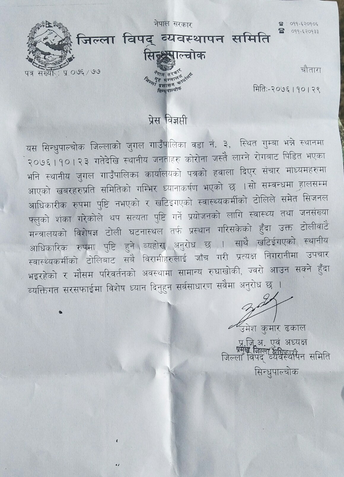 जुगल गाउँपालिकालाई उद्रित गर्दै काेराेना भाइरस जस्तै लक्ष्ण देखिएकाे भनेर सामाजिक सञ्जाल र सञ्चार माध्यममा अाएकाे खबरप्रती जिल्ला विपद् व्यवस्थापन समिति सिन्धुपाल्चाेकले गम्भीर ध्यानाकर्षण भएकाे जनाएकाे छ ।