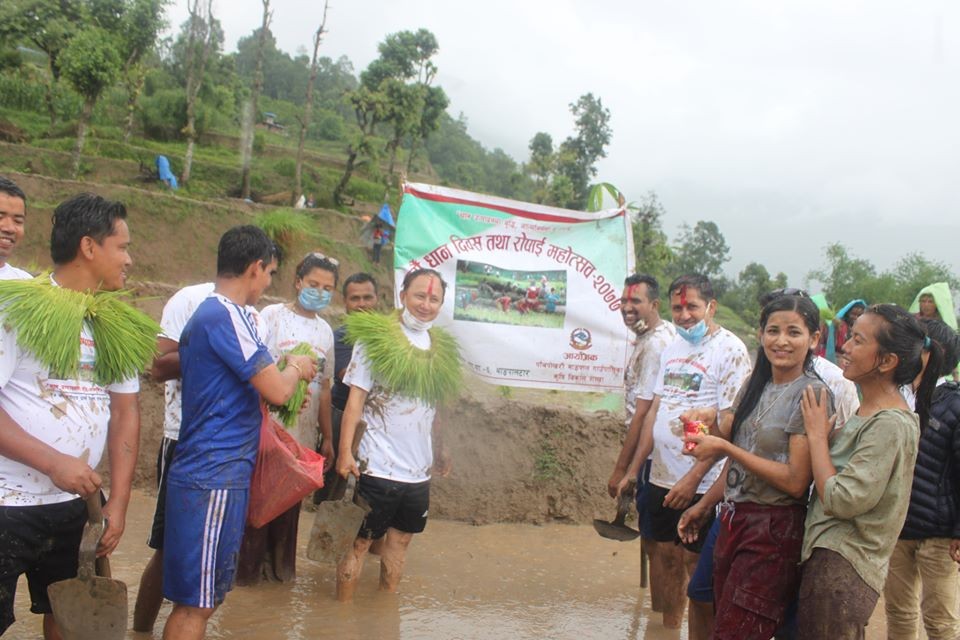 जब रोपाई गर्न गाउँपालिका अध्यक्ष धानको बिउको माल लगाएर निस्किए