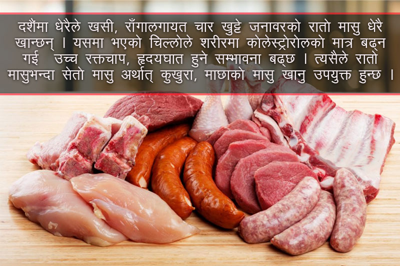 वर्ष दिनमा आउने चाड भनेर दशैंमा अन्य समयमा भन्दा धेरै मासुलगायत अन्य खानेकुरा खाने चलन छ। दशैंको समयमा काम गरिने र खानेकुरा बढी खाने हुँदा हामीले खाएको खाना पचाउनसमेत गाह्रो हुन्छ। दशैंमा धेरैले खसी, राँगालगायतका चार खुट्टे जनावरको रातो मासु अत्यधिक खाने हुँदा यसमा भएको चिल्लोले शरीरमा कोलेस्ट्रोरोलको मात्र बढ्न गई उच्च रक्तचाप, हृदयाघात हुने सम्बावना बढ्छ। त्यसैले रातो मासुभन्दा सेतो मासु अर्थात् कुखुरा, माछाको मासु खानु उपयुक्त हुन्छ।