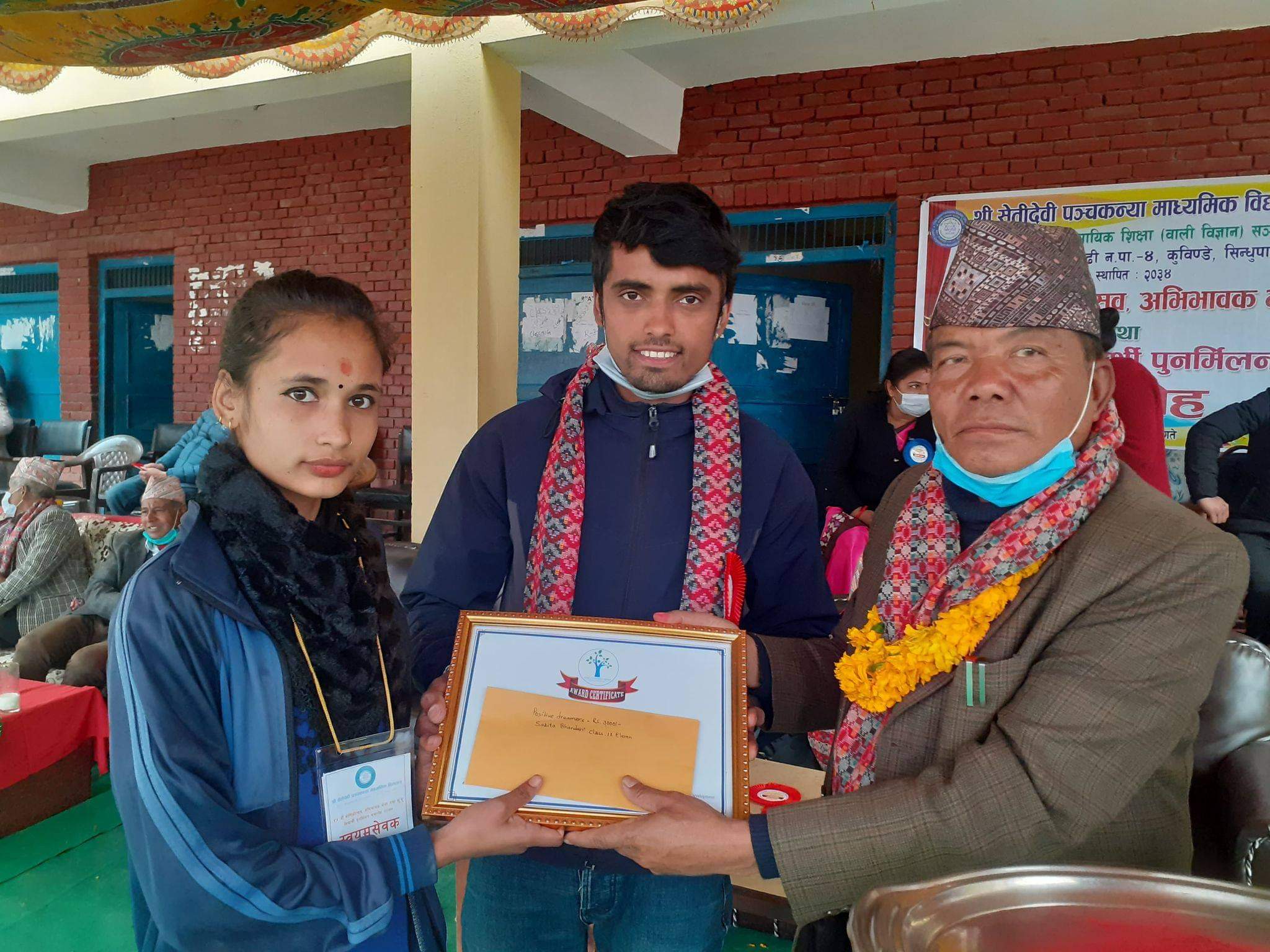 विद्यालयको कक्षा ११ मा अध्यनरत सविता भण्डारी र कक्षा १२ मा अध्ययनरत विजय ठकुरीलाई तीन तीन हजार रूपैयाँ नगदसहित प्रमाणपत्र प्रदान गरिएको पोजेटिभ ड्रिमर्सका सदस्य अर्जुन शर्माले जानकारी दिए।