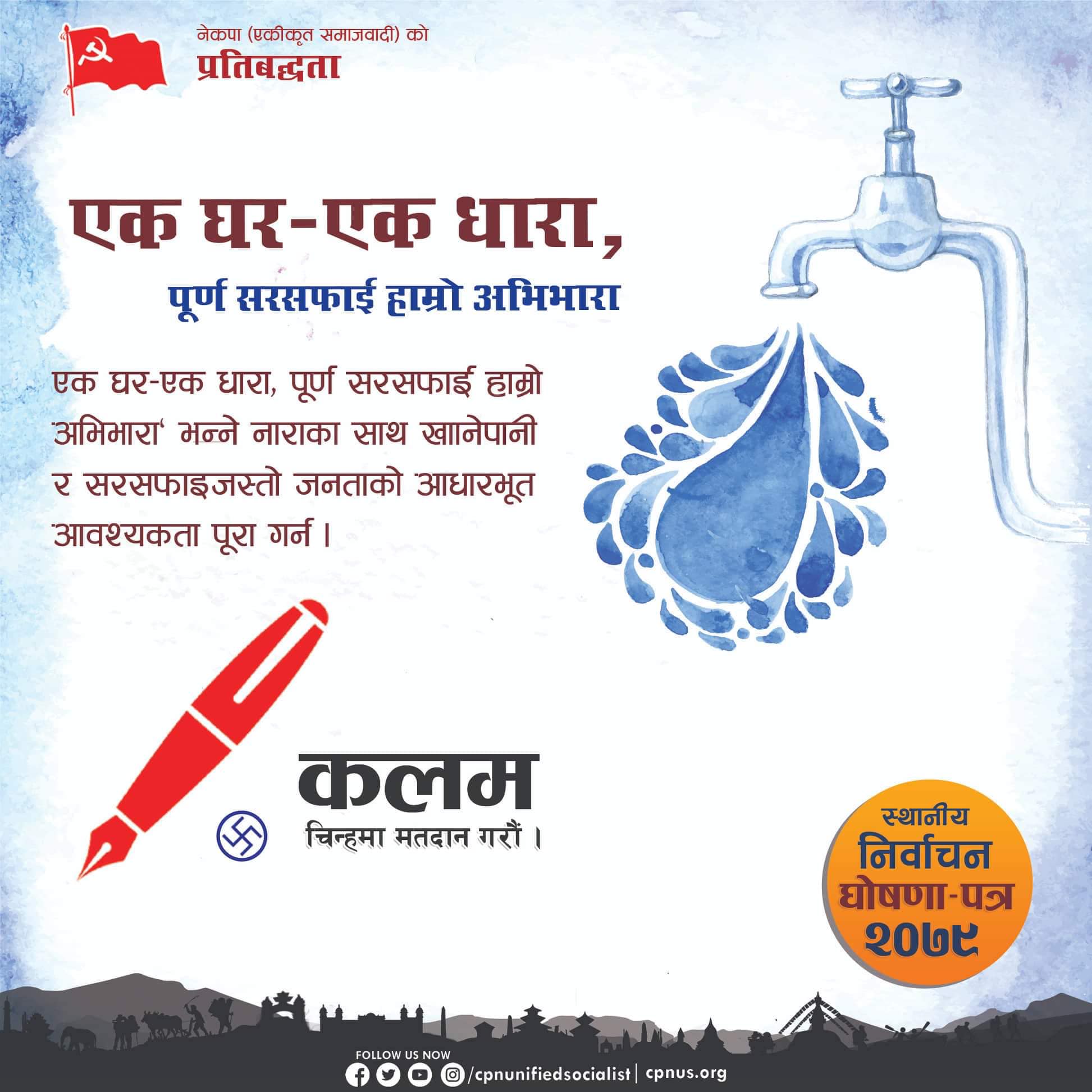 सत्तारुढ गठबन्धनमा समेत सामेल भएको नेपालको दल आफ्नो प्रतिबद्धतामा लेखेको छ, ‘एक घर एक धारा, पूर्ण सरसफाई हाम्रो अभिभारा’ भन्ने नाराका साथ खानेपानी र सरसफाइजस्तो जनताको आधारभूत आवश्यक्ता पूरा गर्न…।’