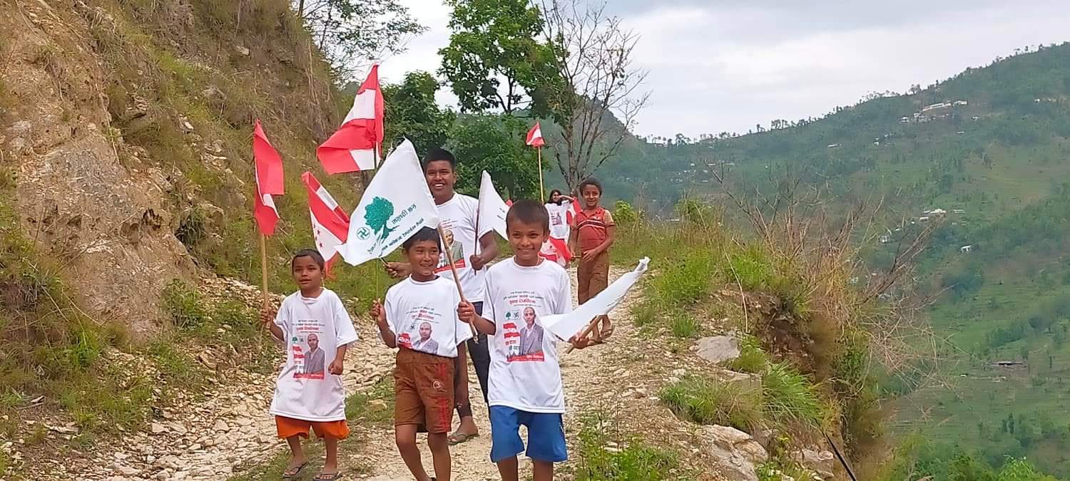 बलेफी गाउँपालिका वडा नम्बर २ को बिस्टे अर्याल डाडा क्षेत्रमा बालबालिकालाई उमेदवारको चित्र अङ्कित टिसर्ट लगायर प्रचारप्रसारमा खटाएको पाइएको हाे।