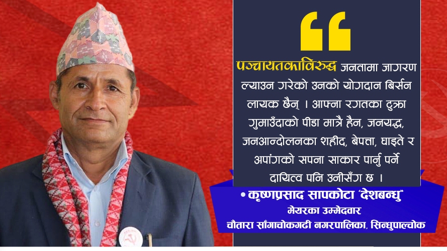 कृष्णप्रसाद सापकोटा आफैमा एउटा योद्धा हो । उहाँ जस्ता लाखौंको त्याग र सुभद्राजस्ता हजारौंको बलिदानबाट प्राप्त भएको गणतन्त्र, संघीयता, समावेशीता, समानुपातिक प्रतिनिधित्व, धर्मनिरपेक्षता र सम्बृद्धिको अजेण्डालाई गाउँदेखि नै कार्यान्वयन गर्ने उत्कट चाहनाका साथ नगरप्रमुखको उम्मेदवार हुनु भएको छ ।