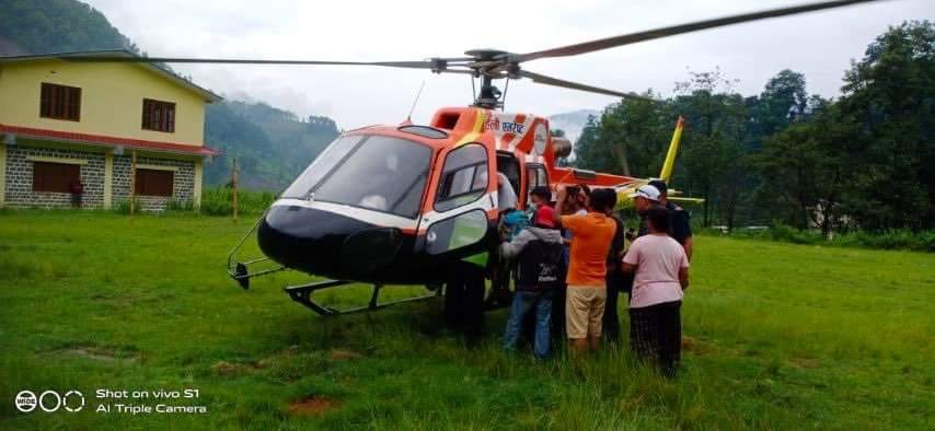 चाैतारा । बाढीकाे कारण सडक अबरुद्ध भएपछि हेलम्बु गाउँपालिका-५ बाट सुत्केरी सहित २ बिरामी महिलाकाे हेलिकप्टर मार्फत उद्वार गरिएकाे छ ।