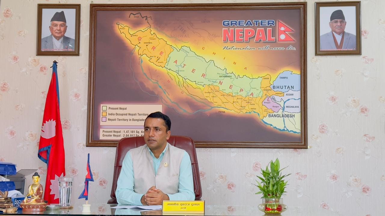 चाैतारा । बागमती प्रदेशका भौतिक पूर्वाधार विकासमन्त्री युवराज दुलाल ‘शरद’ ले कार्यकक्षमा ‘ग्रेटर नेपाल’ को नक्सा राखेका छन् । बिहीबार मन्त्री दुलालको कार्यकक्षमा ग्रेटर नेपालको नक्सा राखेका हुन् ।