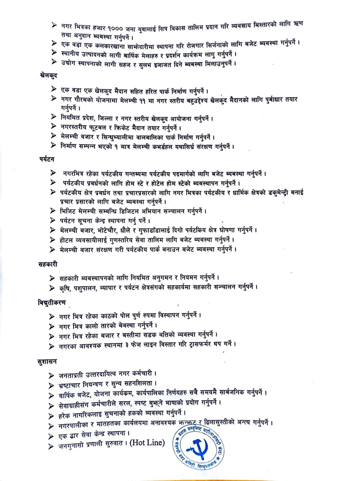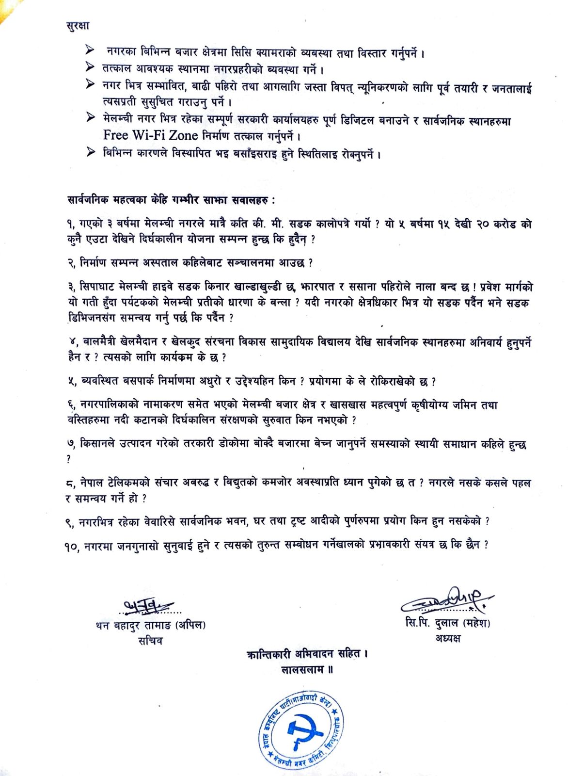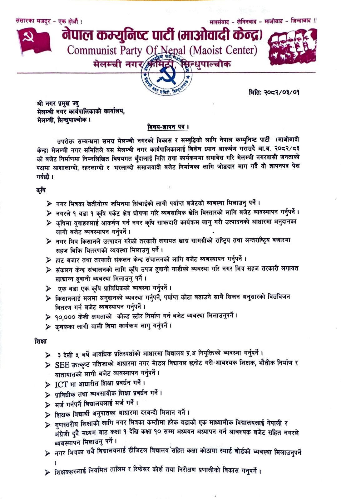 आर्थिक वर्ष २०८२/८३ का लागि मेलम्ची नगरपालिकाले ल्याउने बजेटमा समाजवादी योजना तथा कार्यक्रम समेटिनुपर्ने माग राख्दै माओवादी केन्द्र मेलम्ची नगर अध्यक्ष सी.पी. दुलालको नेतृत्वमा आइतबार नगर प्रमुख आइतमान तामाङलाई उक्त ज्ञापनपत्र बुझाइएको हो।