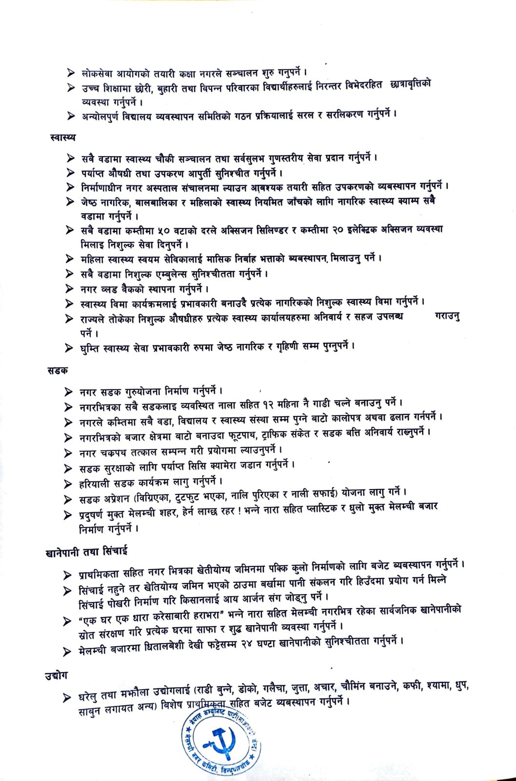 ज्ञापनपत्रमा नगरभित्रका खेतियोग्य जमिनमा सिंचाइको लागि पर्याप्त बजेट विनियोजन गर्नुपर्ने, “एक वडा एक खेलमैदान” कार्यक्रम सञ्चालन गर्नुपर्ने, तरकारी बीउ-बिजन भण्डारणका लागि कोल्ड स्टोरेज निर्माण गर्नुपर्ने मागहरू उल्लेख छन्।
